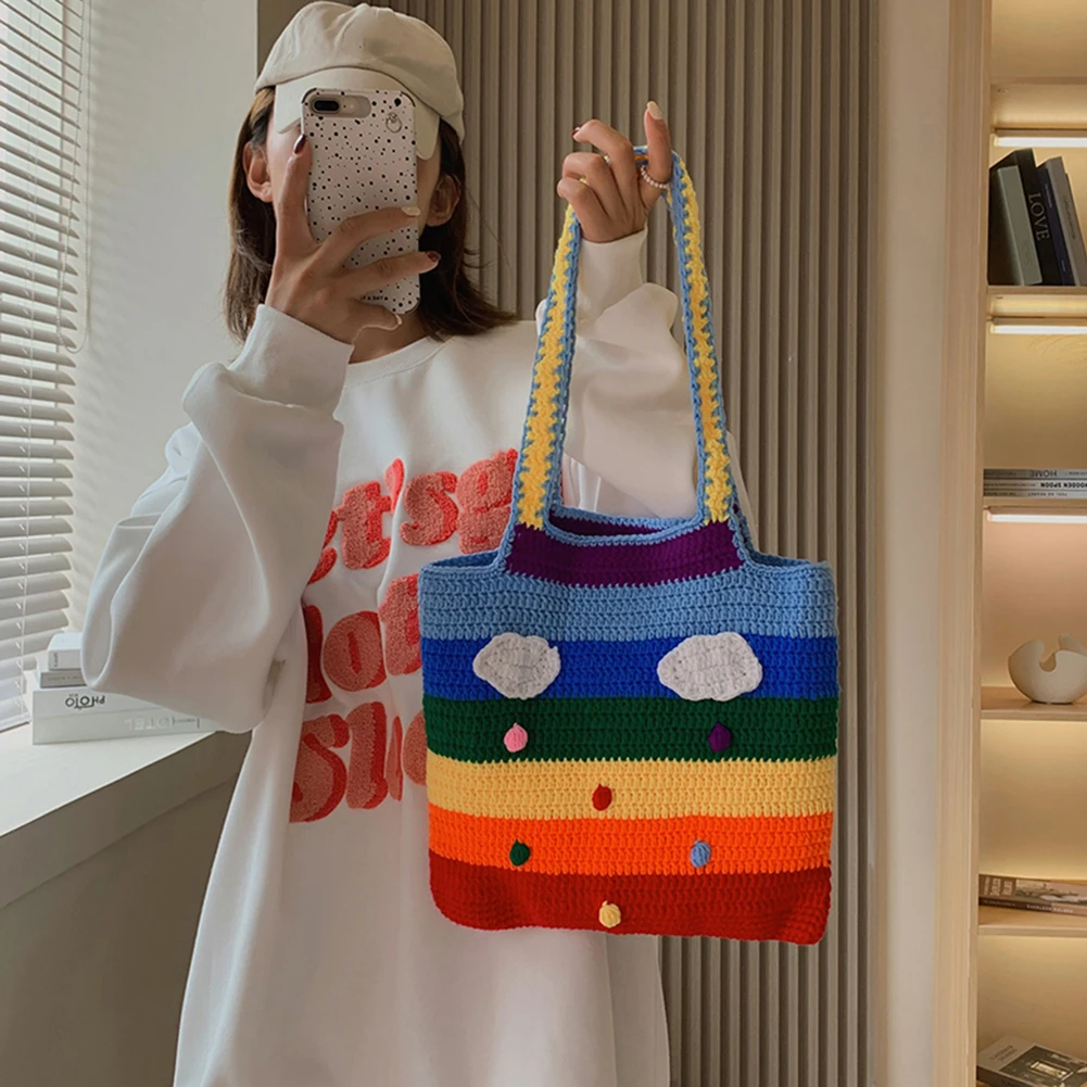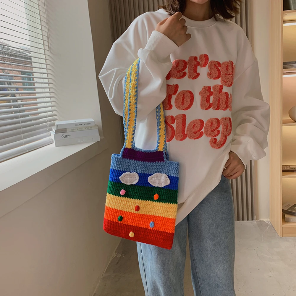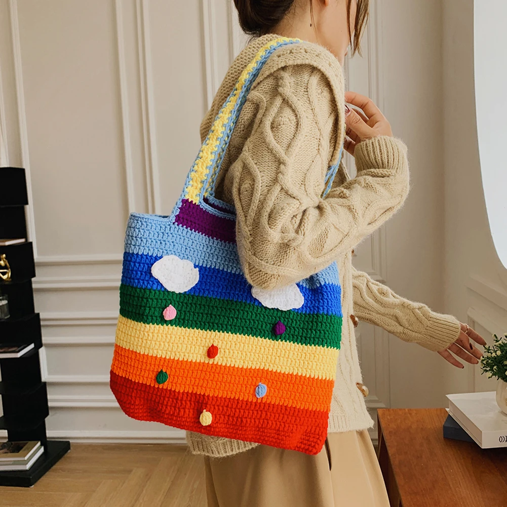 Радужная красочная сумка через плечо, Модная вязаная полосатая Сумочка, Женская Повседневная Большая вместительная Фотосумка, горячая рас...