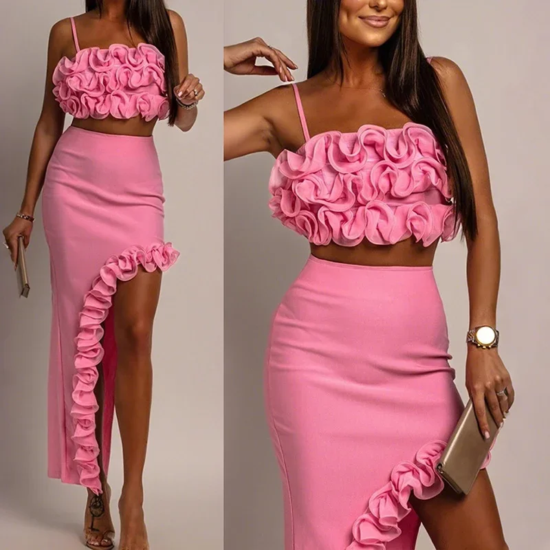 Размерная юбка с лямкой на шее и цветочным принтом, сексуальные топы с открытыми плечами и разрезом, костюм из 2 предметов, женские элегантные однотонные тонкие комплекты без рукавов для вечеринок