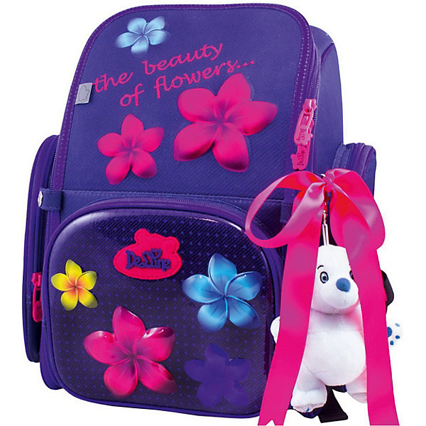 Все фирменные карабины, бегунки, пластиковые и декоративные элементы, выполнены в детской стилистики бренда DeLune. Каркас не деформируется при нагрузке и распределяет вес по всей площади ранца. Внутреннее оснащение ранца разработано по специальной системе распределения вещей «Open access» что позволяет удобно распределить школьные принадлежности ребенка. В комплекте мягкая игрушка для девочек - белый медвежонок. Для крепления брелка используется карабин.