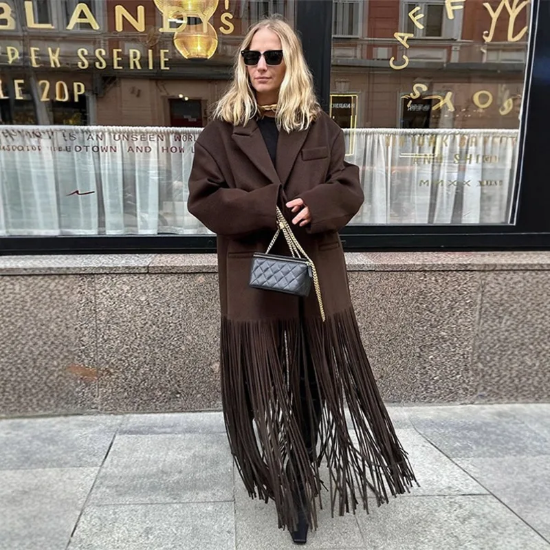 Ранняя осень, новая коллекция, элегантный высококачественный однотонный длинный плащ с лацканами и кисточками в стиле пэчворк, модная верхняя одежда высокого класса