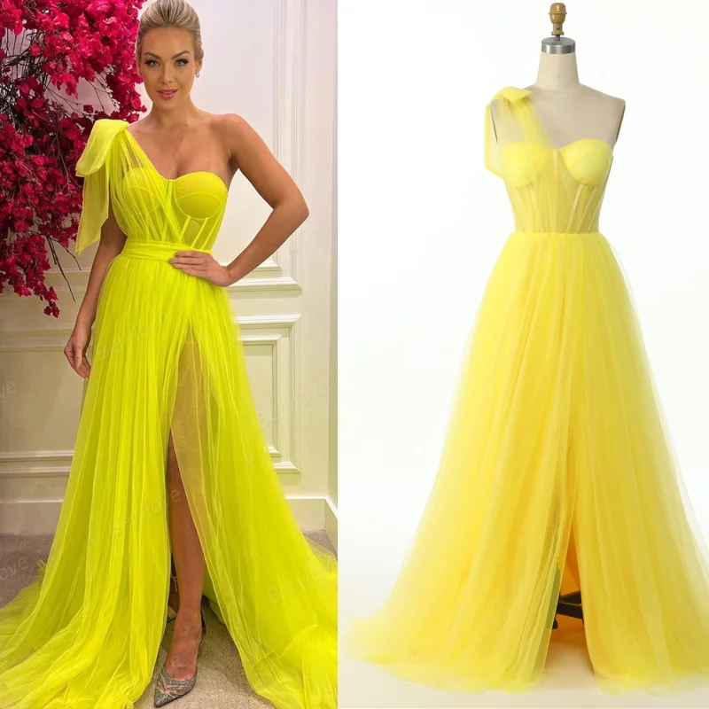 Реальное фото желтое платье на одно плечо для выпускного вечера милое длинное Плиссированное Тюлевое вечернее платье с высоким разрезом эл...