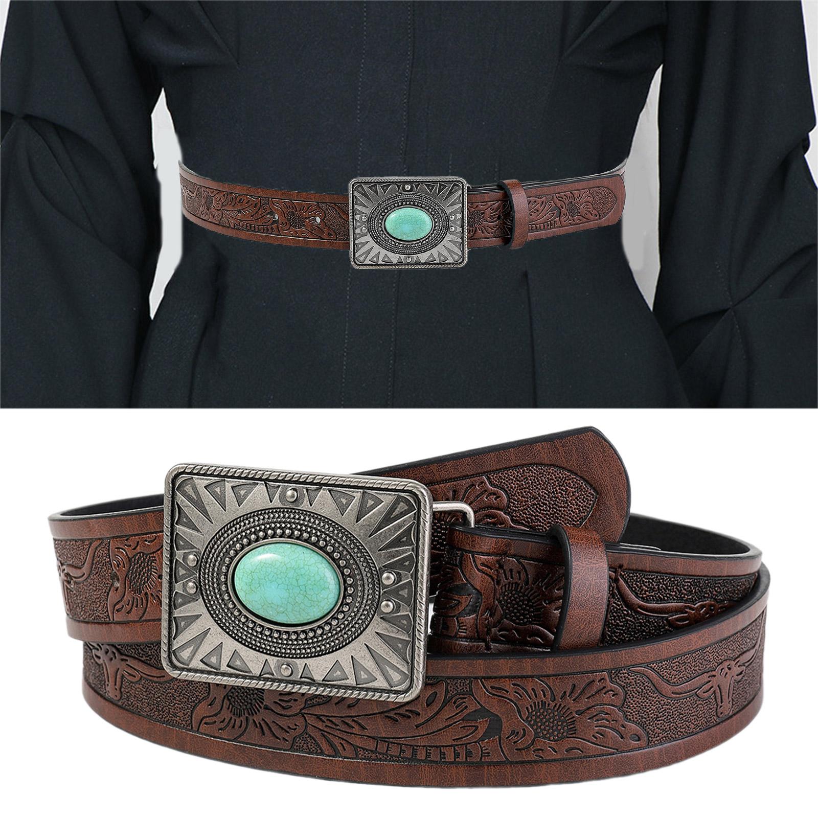 Ремень с бирюзовой пряжкой, эстетичный ремень из искусственной кожи, ковбойский пояс, декоративный ремень для брюк и джинсов, элегантный пояс в стиле бохо E