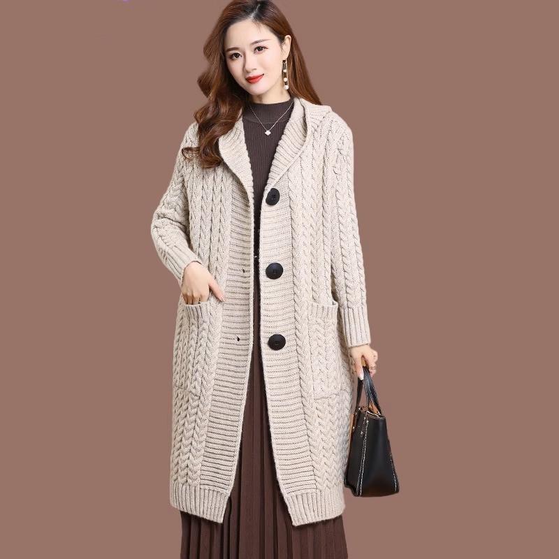 Ретро Вязаный Кардиган с Косами для Женщин Большого Размера Средней Длины Свитер-Пальто Осенне-Зимняя Одежда Длиной до Колена Вязаное Пальто с Капюшоном S бежевый