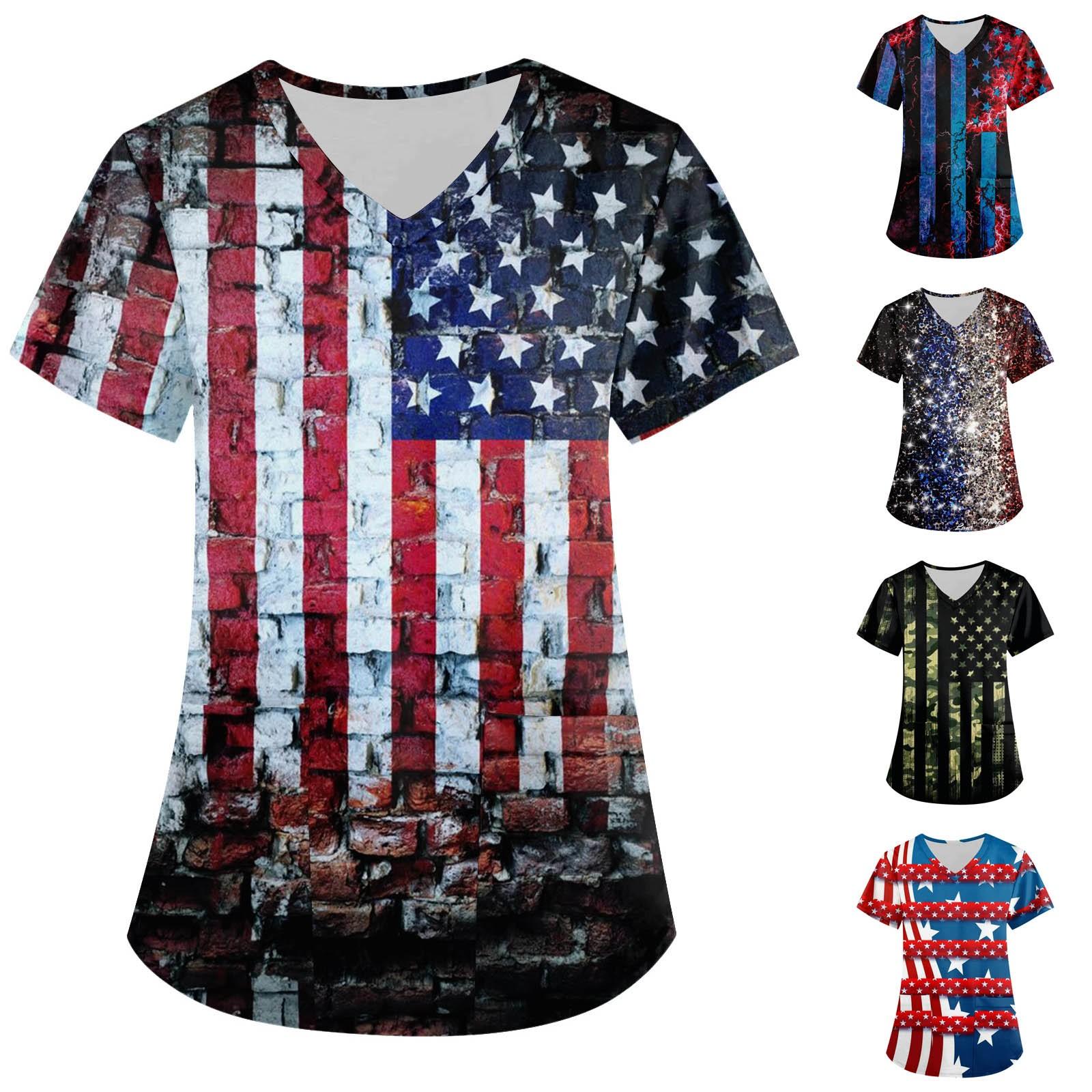 Ретро День Независимости Больших Размеров Скраб Скраб Рабочая Униформа Топы Для Женщин Кросс V-образный вырез Короткий рукав Веселые футболки Рабочая одежда Футболка с карманами