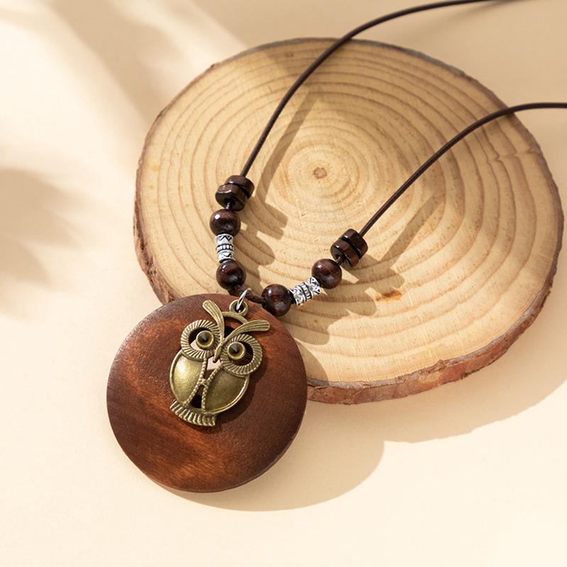 Ретро Деревянный Лист Сова Длинная Цепочка для Свитера Этническое Круглое Ожерелье Женщины Подвеска Часы Женские Ювелирные Изделия Аксессуары для Шеи Подарки Колье