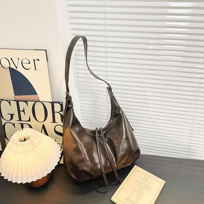 Ретро Сумка-тоут большой вместимости в стиле кэжуал с мягкой поверхностью, простая однотонная, через плечо, на одно плечо кофейный