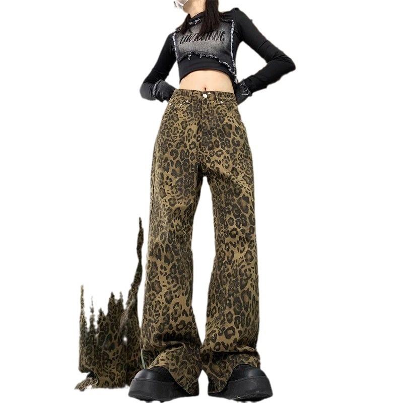 Ретро Хай-стрит Широкие штанины Леопардовый принт Дизайн Новый стиль Джинсы Свободные Высокая талия Прямые брюки до пола 2XL