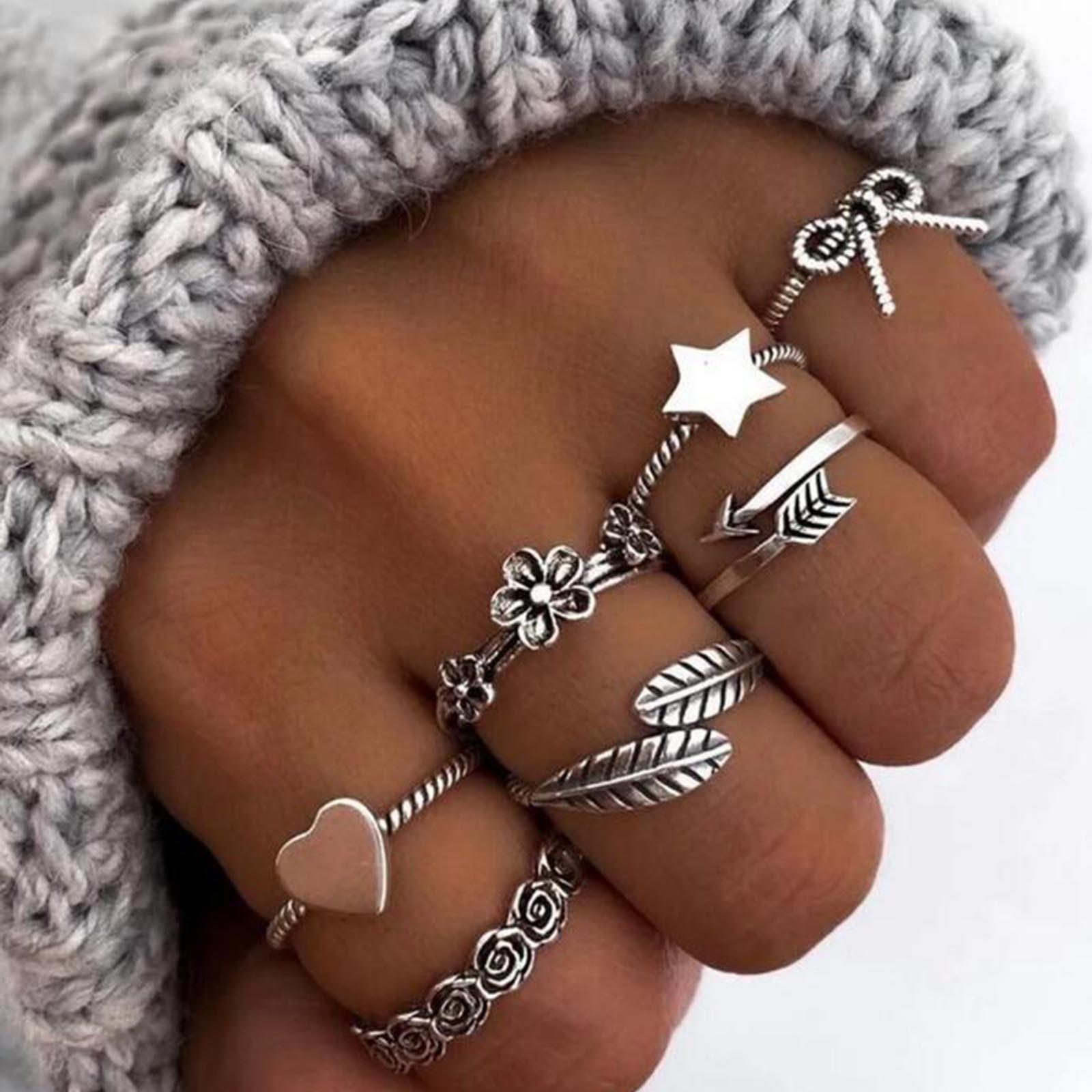 Ретро геометрическое полое сердце с бантом, пятиконечная звезда, 7 комплектов украшений для рук с кольцами One Size