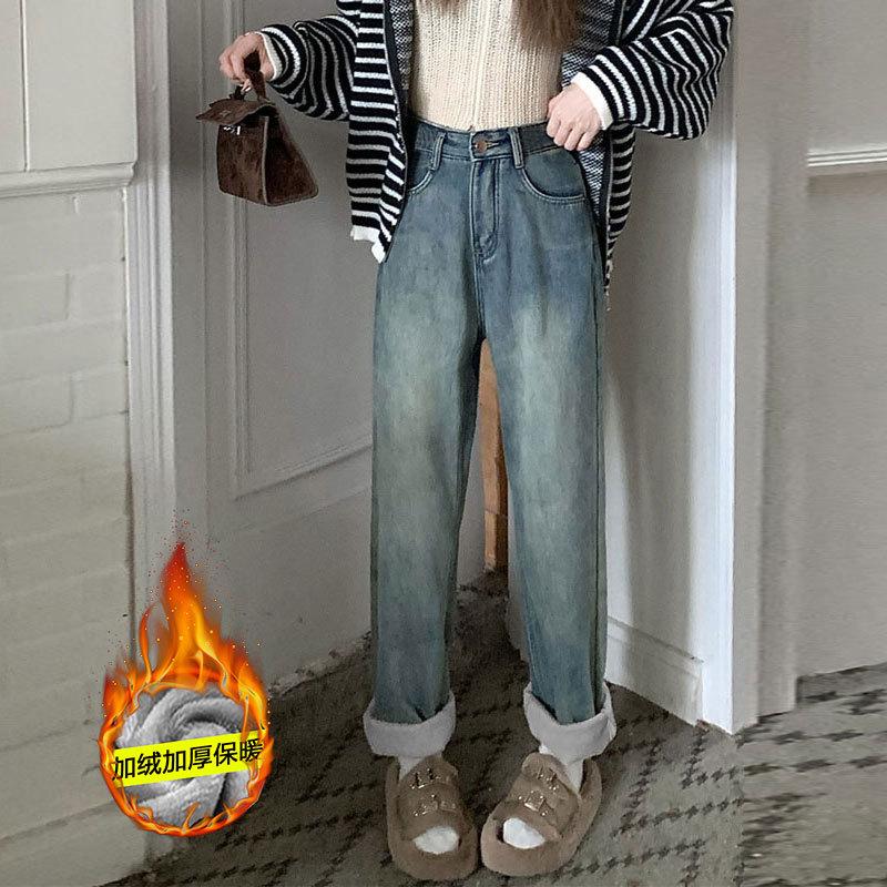 Ретро и ностальгические широкие джинсы для женщин с плюшем, свободный крой, высокая талия, теплые, облегающие пол, толстые прямые штанины, длинные брюки для зимы