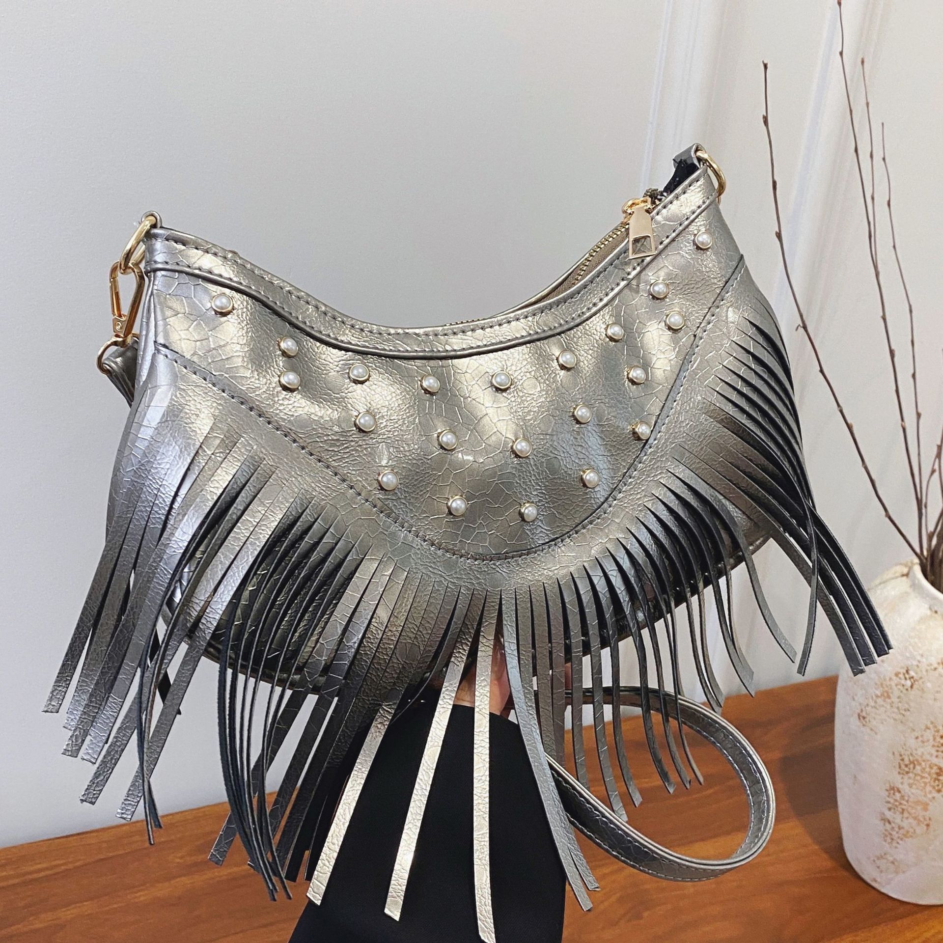 Ретро повседневная сумка-подмышка с бахромой женская 2025 осень новая трендовая заклепка монгольский деним плечевая сумка-мессенджер серебряный