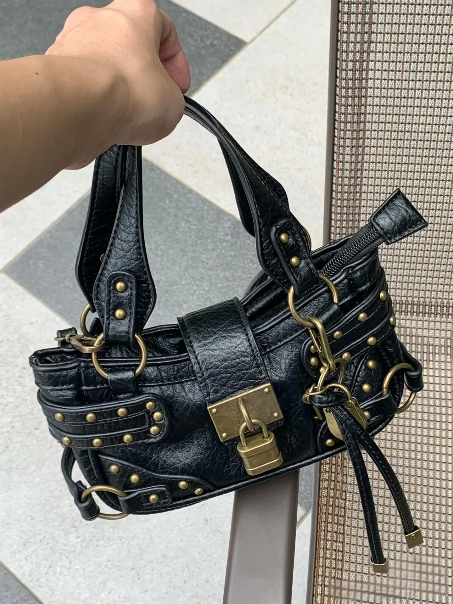 Ретро уличная сумка с металлическим замком, женская сумка через плечо с заклепками для девочек, большая вместительная сумка через плечо, женская кожаная сумка Y2k, эстетичная сумка через плечо, новинка