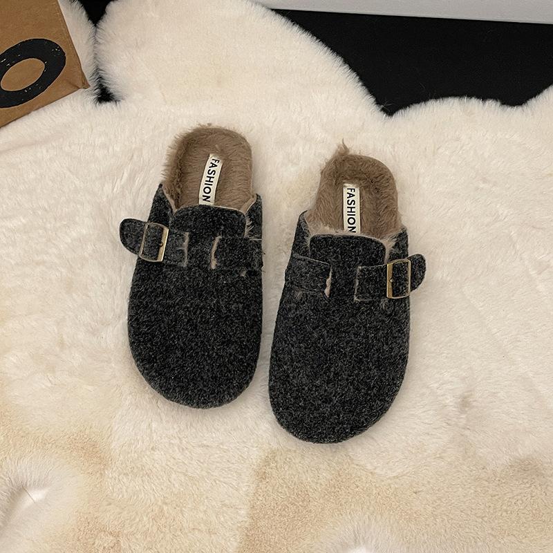 Ретро французский сказочный ветер пух хлопок тапочки женские 2025 осень и зима новые уличные на одной педали теплые толстая подошва хлопок швабра 40 черный серый