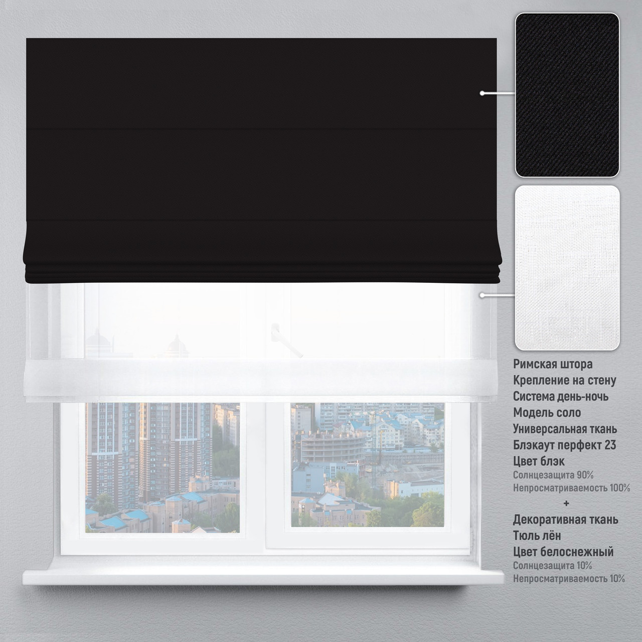 Римская штора цепочно-роторный карниз день-ночь блэкаут-перфект черный тюль лен белый 150х170 см