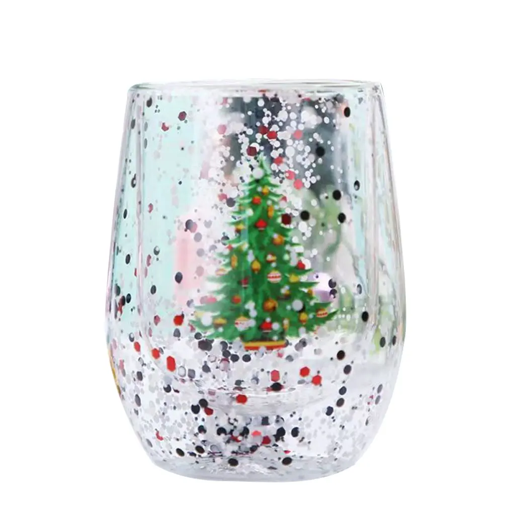 Рождественская чашка, термостойкая двухслойная стеклянная чашка с плавными блестками, милая мультяшная Снежинка, Рождественская елка, памятная чашка