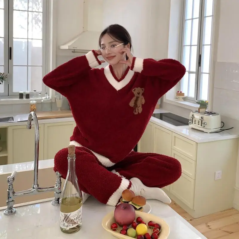 Рождественский пижамный костюм с v-образным вырезом для девочек, осенне-зимний милый комплект ночного белья, сохраняющий тепло, милая домашняя одежда, утепленная женская одежда для сна с полуворсом