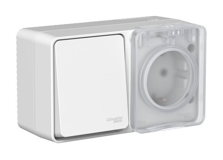 Розетка Systeme Electric AtlasDesign Profi54, открытый монтаж, однопостовая, с з/к, со шторками, с крышкой, 16А, в сборе, IP54, с выключателем, серый, 1 шт. (ATN543070)