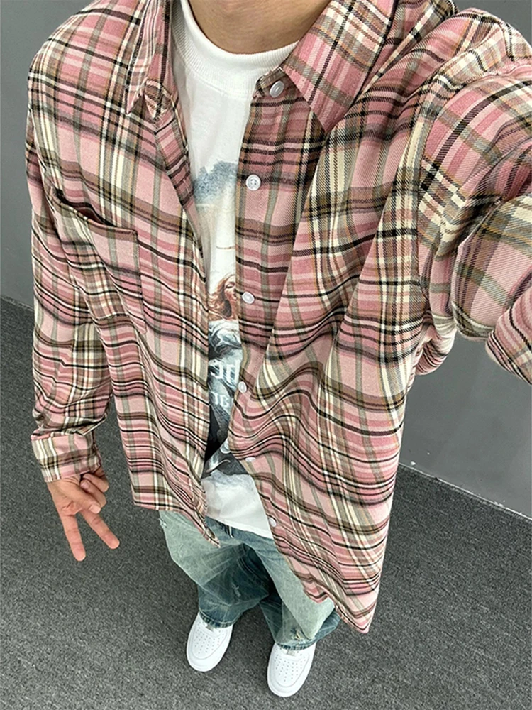 Розовая мужская длинная клетчатая одежда в стиле ретро в стиле ретро, летняя винтажная верхняя одежда с защитой от солнца в американском стиле, молодежная тенденция