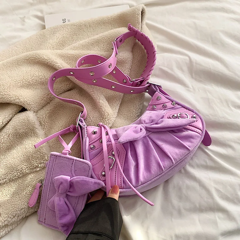 Розовая популярная женская сумка с заклепками и цепочкой с бантом, 2023, роскошная дизайнерская сумка в стиле панк для подмышек, черная, корич...