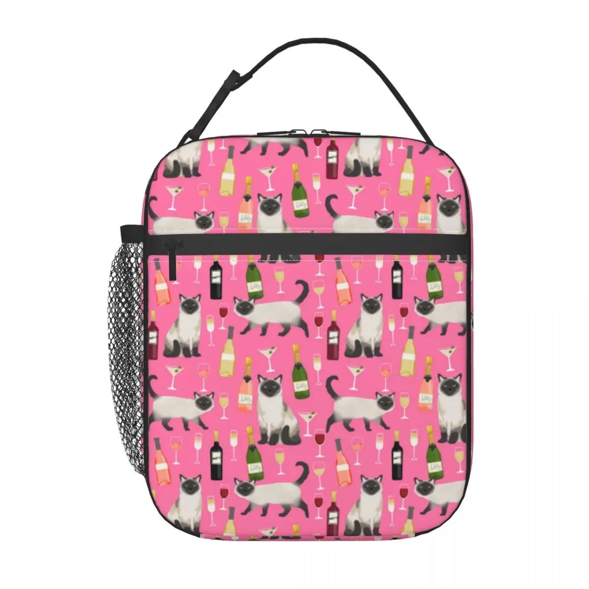 Розовая сумка для ланча с винным принтом и ручкой, Симпатичная хлопковая Сетчатая Сумка-холодильник с сиамским котом и жемчугом, Модная эле...