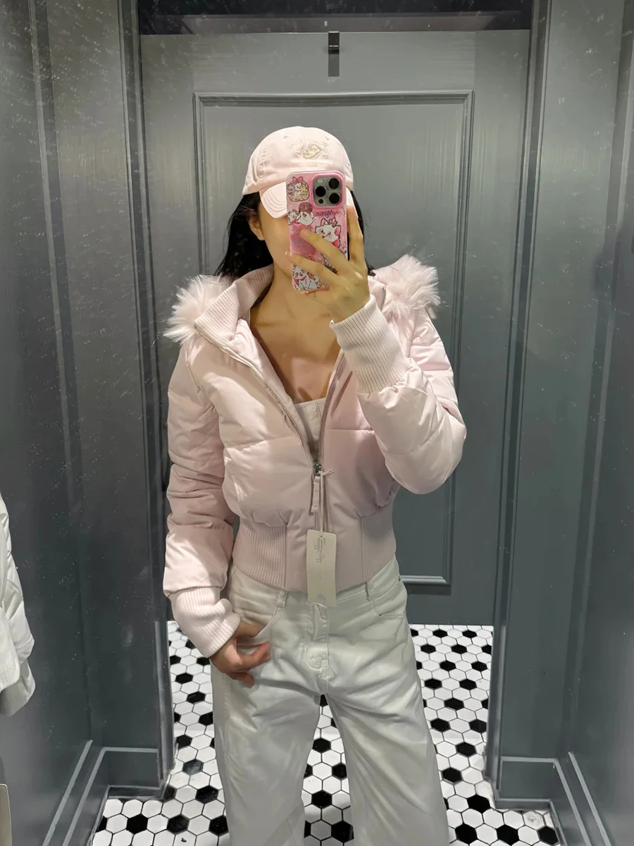 Розовая хлопковая куртка со съемным меховым воротником и капюшоном, женская зимняя приталенная универсальная милая американская укороченная теплая хлопковая куртка, милые топы