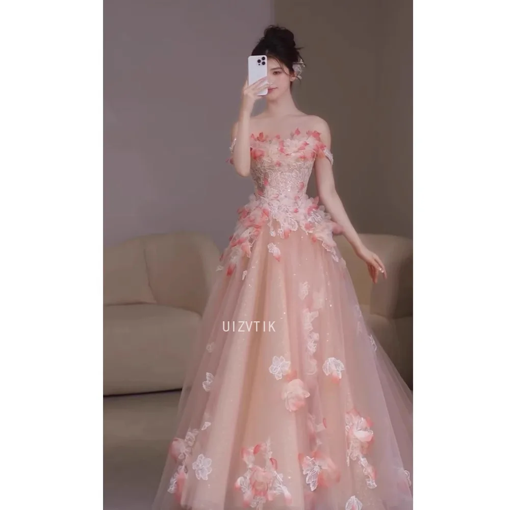 Розовое платье для особых случаев, женское 3D цветы, милая аппликация, кружевное вечернее платье с открытыми плечами, вечерние платья по индивидуальному заказу