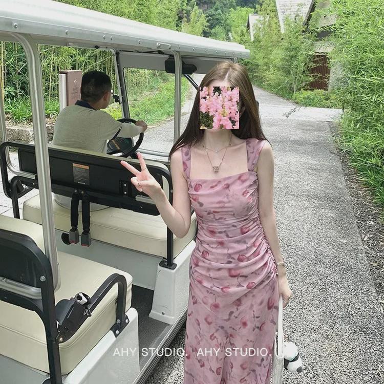 Розовое платье с цветочным принтом без рукавов на подтяжках - Лето 2024 г. Тонкое и элегантное длинное платье Small розовый