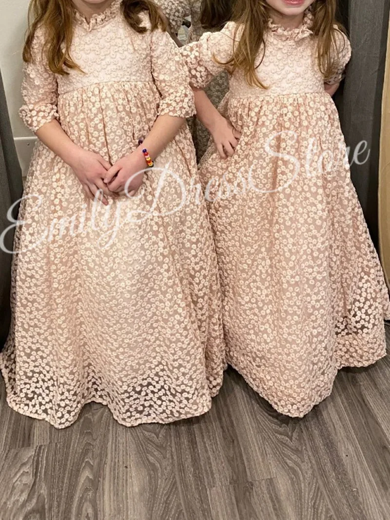 Розовое платье с цветочным узором для девочек на свадьбу с короткими рукавами, пышное молочное кружево длиной до пола, платье для первого причастия на день рождения