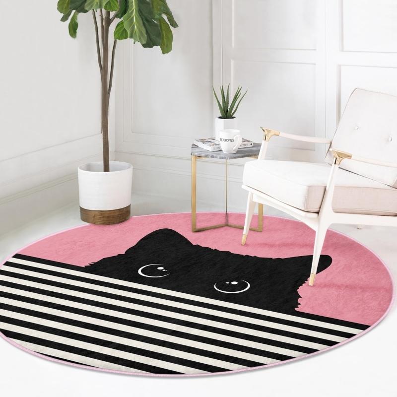 Розовый напольный полосатый мотив Черный кот Дизайн Современный кухонный круглый ковер с моющимся нескользящим основанием
