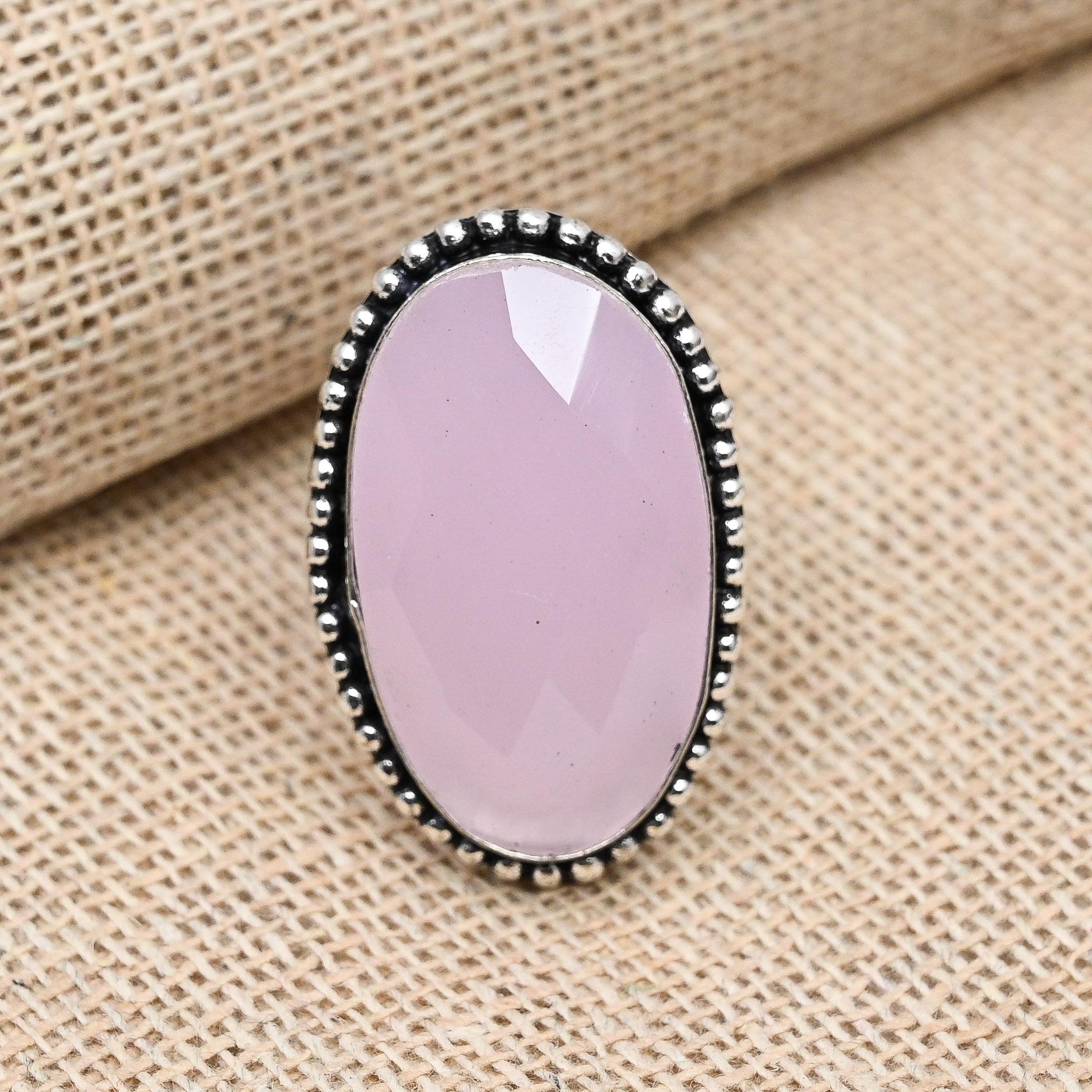 Розовый халцедон Драгоценный камень Твердые стерлингового серебра 925 пробы Ювелирные изделия ручной работы Отличное кольцо 7 розовый