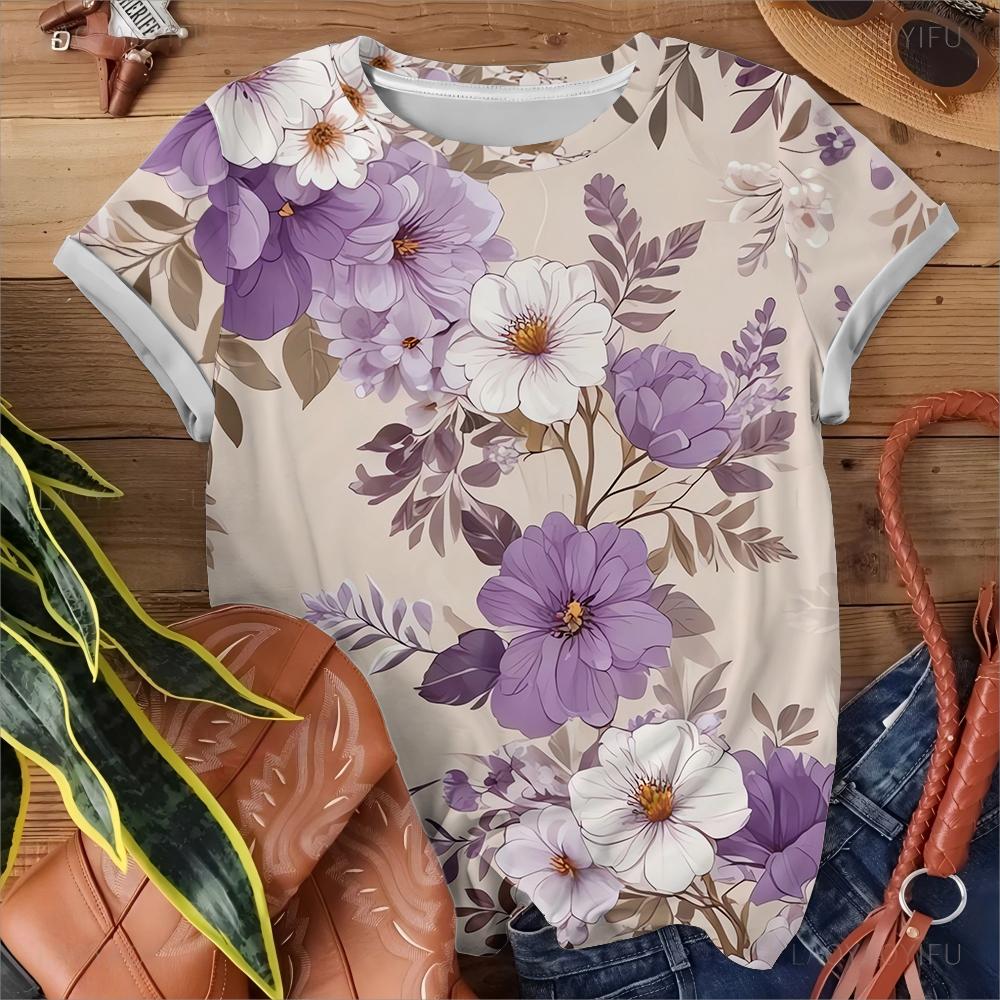 Романтичная загородная фиолетово-белая футболка с цветочным принтом, летняя, повседневная, универсальная, женская, с коротким рукавом L