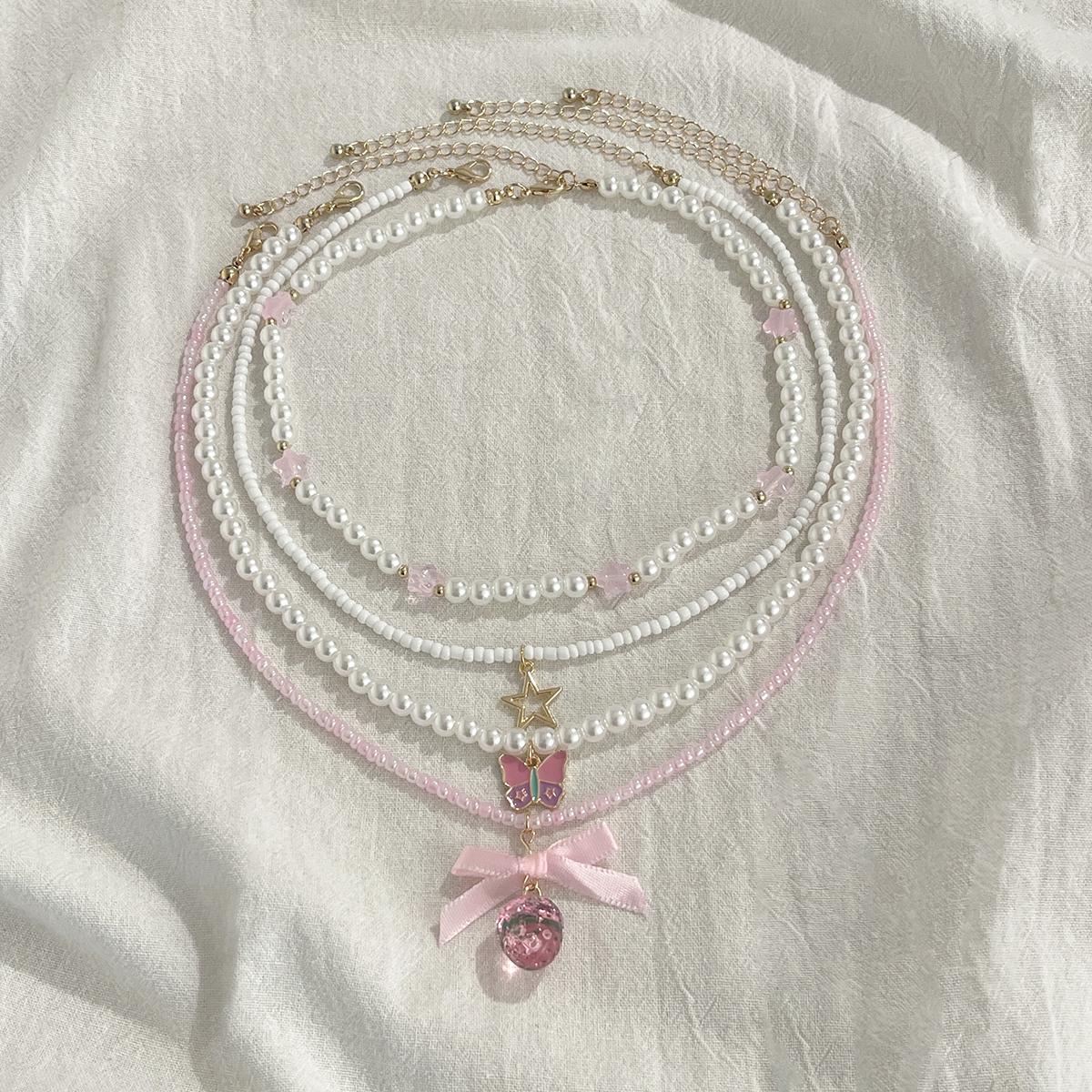 Романтичное Милое Розовое Клубничное Ожерелье-Подвеска с Бантиком для Женщин, Многослойный Чокер из Имитации Жемчуга, Ювелирные Аксессуары