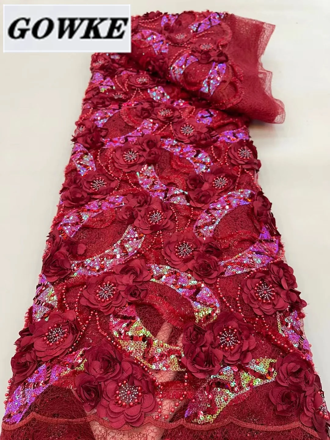 Роскошная винно-красная кружевная ткань с бусинами Нигерия Харви ручной работы 3D аппликация цветок с жемчугом Тюль Ткань для свадьбы