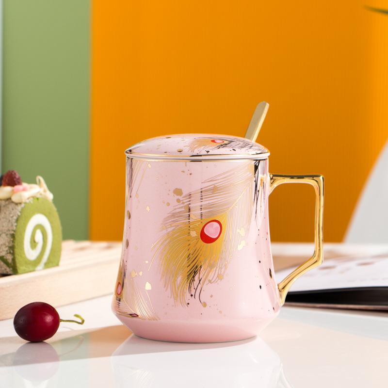 Роскошная керамическая кружка с перьями павлина, ложка с крышкой, кофейная чашка, новогодние кружки, чашки и кружки, посуда для напитков, кружка для чая, оригинального пива