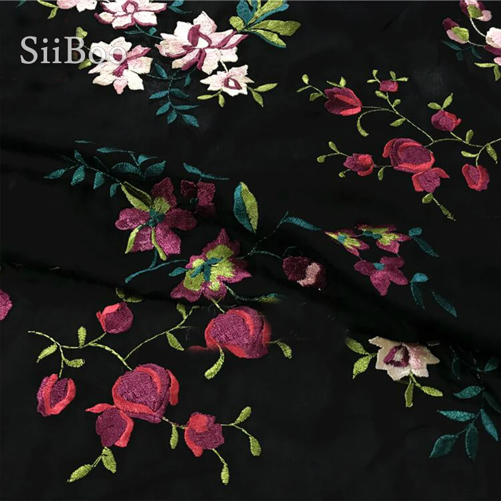 Роскошная черная с розовой Красной цветочной вышивкой хлопчатобумажная шелковая ткань для платья Тяжелая вышивка шелковая ткань тканевая пряжа SP5016