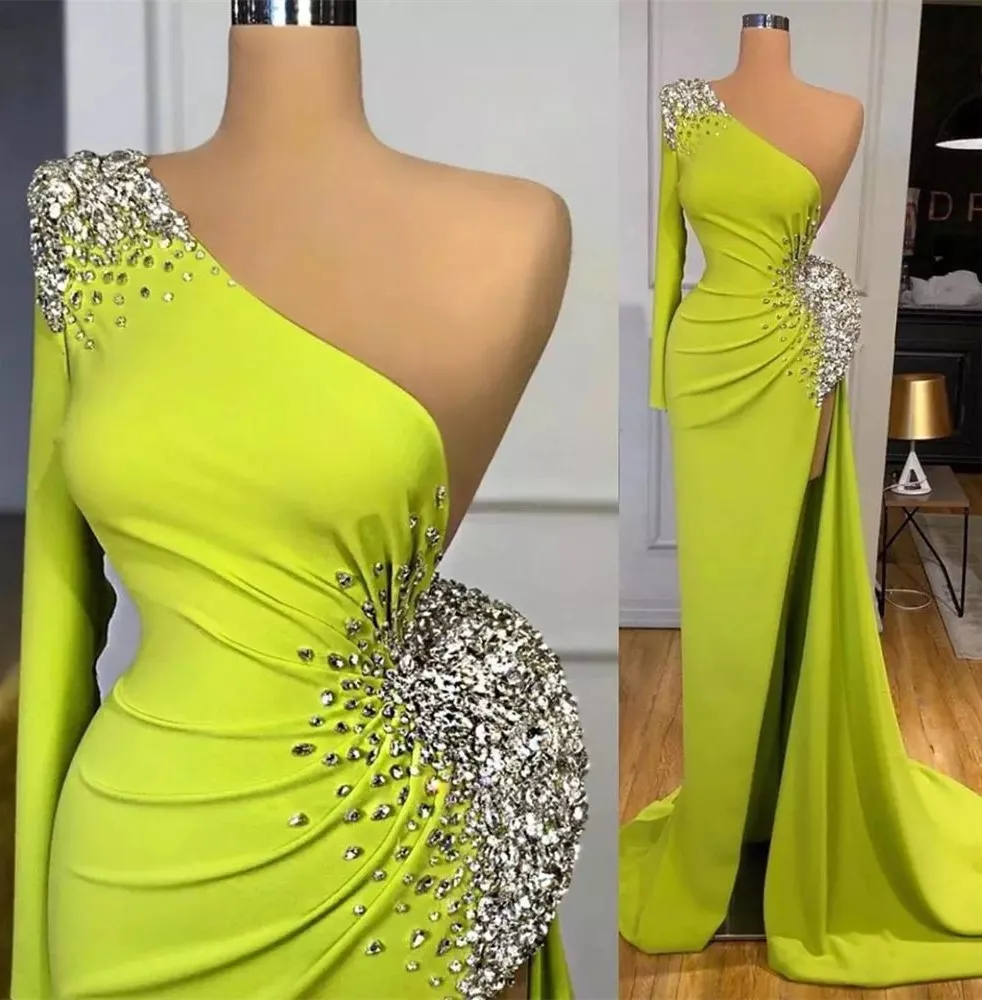 Роскошное Хрустальное Пышное женское платье на одно плечо с длинным рукавом с разрезом для выпускного вечера сексуальное зеленое персонал...