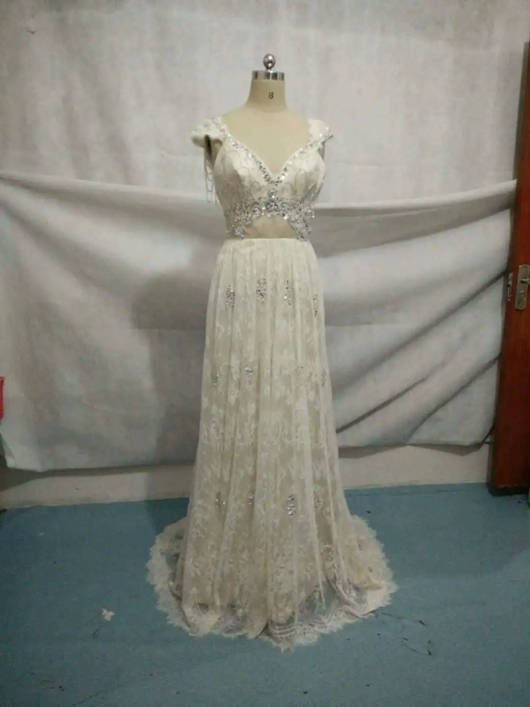 Роскошное длинное свадебное платье с V-образным вырезом, украшенное бусинами, сексуальные кружевные свадебные платья цвета шампанского с о...
