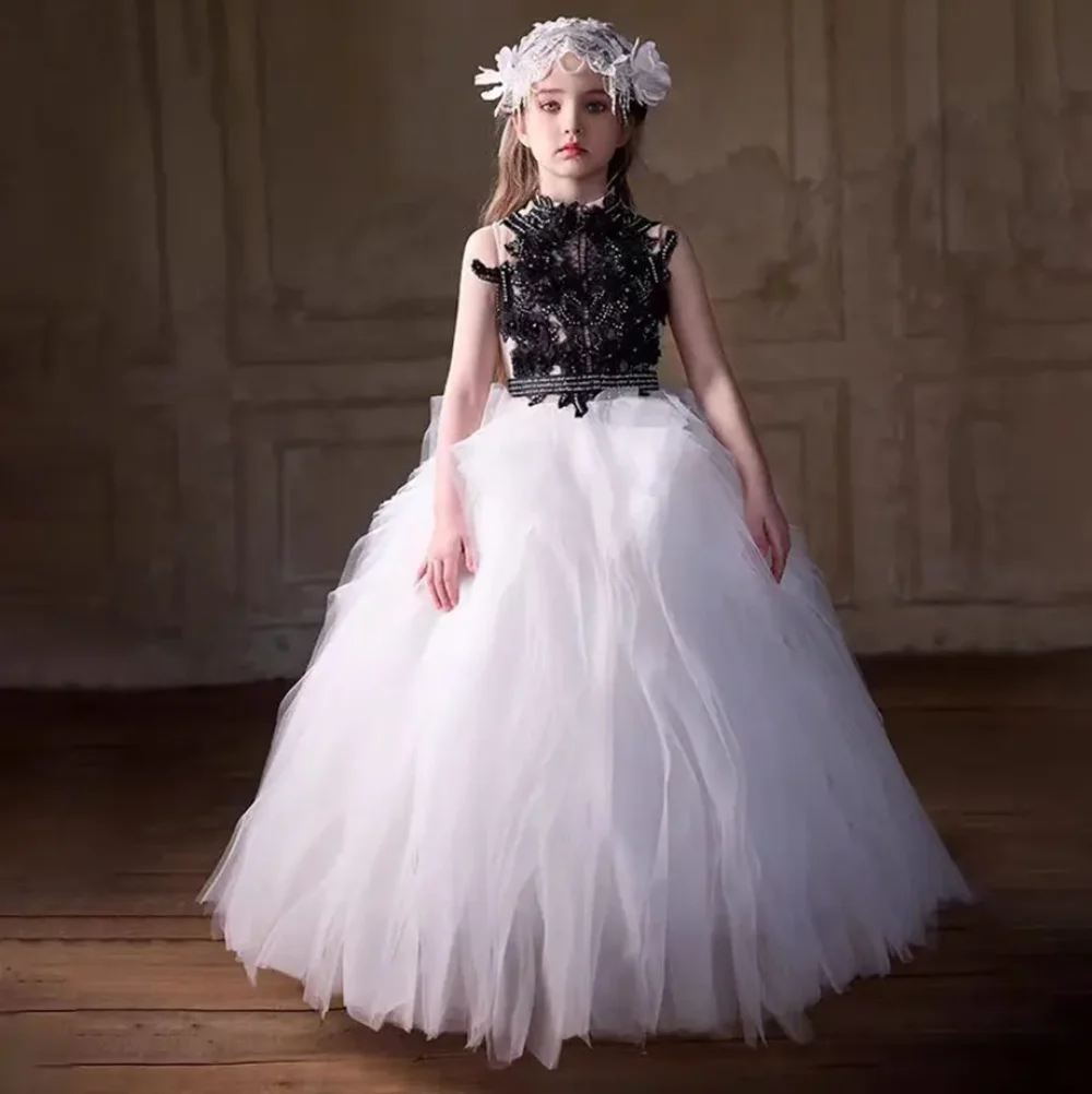 Роскошное черно-белое платье с цветочным узором для девочек, расшитое бисером, детское праздничное платье принцессы на свадьбу, день рождения, вечернее платье
