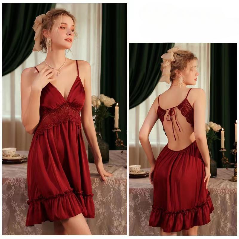 Роскошные Сексуальные Шелковые Ночные Сорочки Кружевное Сатиновое Ночное Платье Новые Летние Женские Домашние Пижамы на Бретелях Нижнее Белье Длинное Платье для Сна one size красный