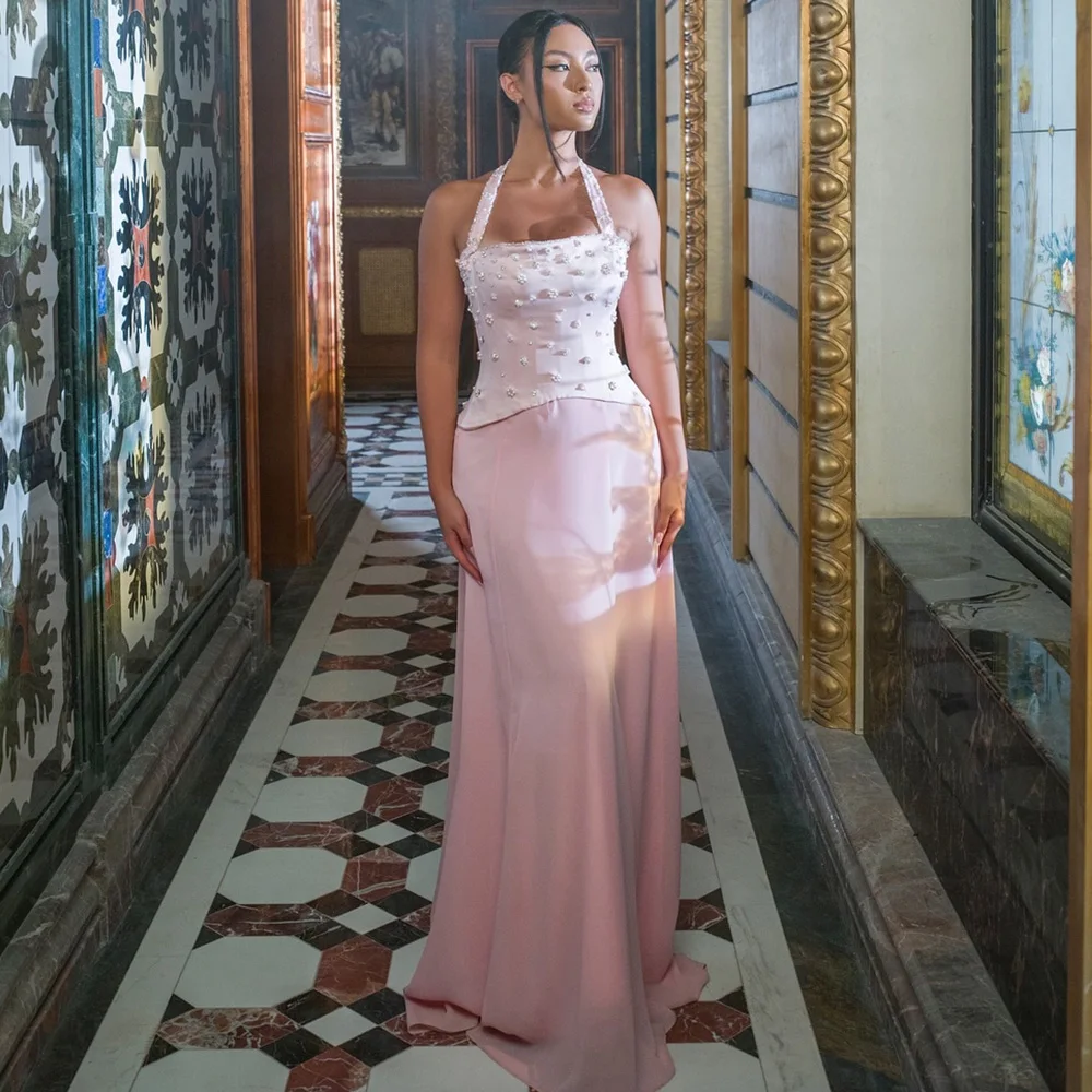 Роскошные женские вечерние платья, атласное платье-футляр/колонна на день рождения, розовые платья с лямкой на шее и жемчугом, женские длинные платья для выпускного вечера 2023
