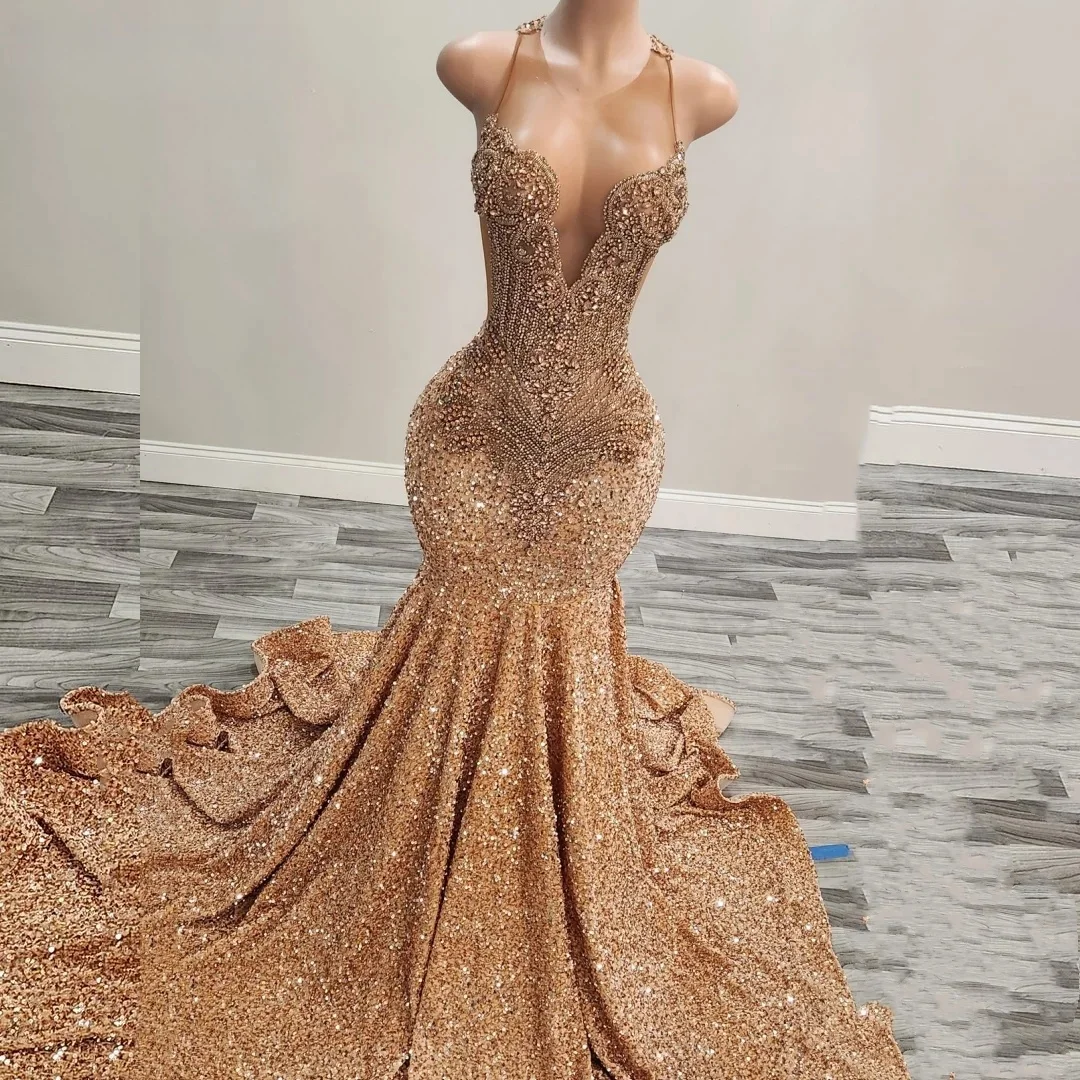 Роскошные золотые длинные платья для выпускного вечера для черных девочек, платья для дня рождения с кристаллами и блестками, вечернее платье в африканском стиле, Robe De Customized