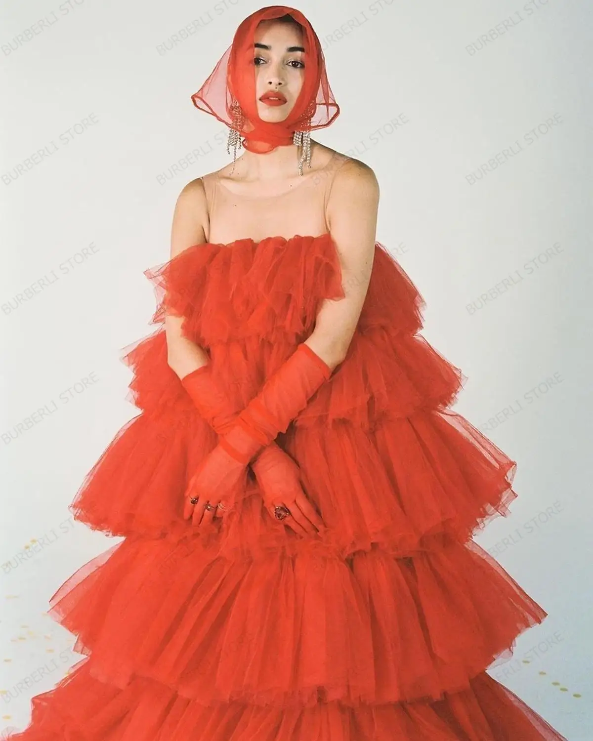 Роскошные красные очень пышные тюлевые платья в Пол Вечерние Ярусное вечернее платье без бретелек женское Тюлевое платье большого размера