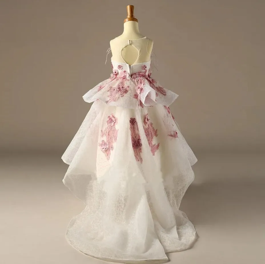 Роскошные платья с цветочным принтом для девочек, платье с аппликацией и оборками, с прозрачным вырезом, пышное платье принцессы, платье для причастия, с длинным хвостом