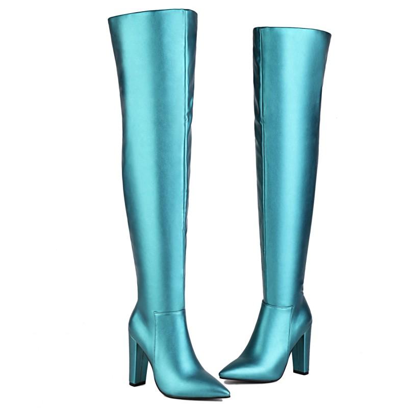 Роскошные сапоги выше колена, женские сексуальные туфли на высоком каблуке для вечеринок и танцев, зимние женские сапоги серебристо-голубого цвета, большой размер 45 39 синий