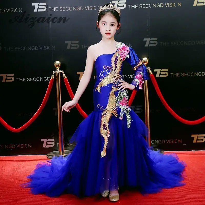 Роскошный Королевский синий в китайском стиле с вышивкой и сексуальное платье на одно плечо для девочек в цветочек в китайском стиле вечернее платье со шлейфом кисточкой аппликация Выпускные платья