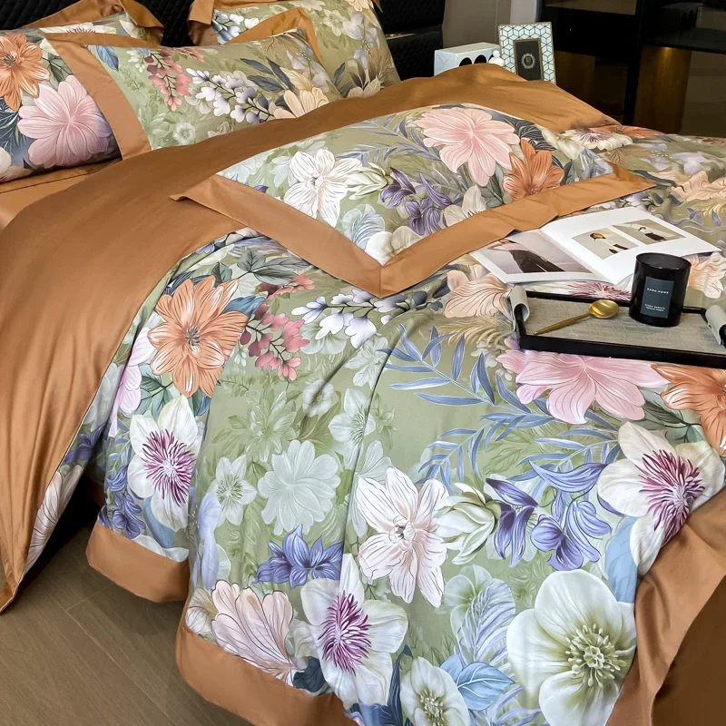 Роскошный комплект постельного белья с европейским цветочным принтом — египетский хлопок, приятный для кожи, размер королевы/короля, плоская простыня и наволочки