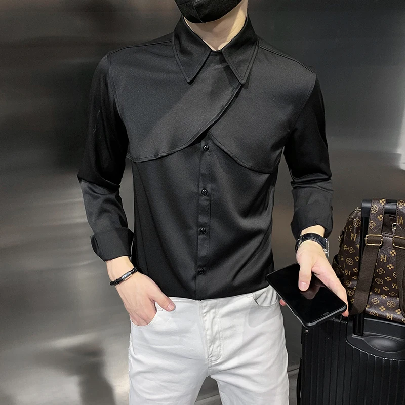 Рубашка мужская однотонная с длинным рукавом, модная Клубная смокинг, уличная одежда, простая приталенная, в Корейском стиле, черный/белый ц...