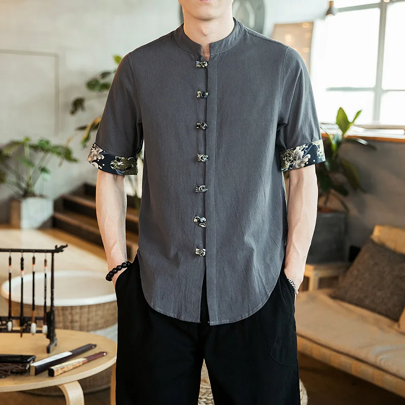 Рубашка мужская повседневная из хлопка и льна, приталенная Удобная крутая одежда в китайском стиле, с рукавом до локтя, домашняя сорочка, ле...