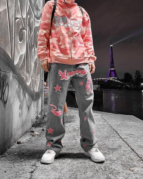 women's jeans retro pink embroidery jeans woman print star slouchy vintage baggy women wide leg y2k pants 230110, Blue