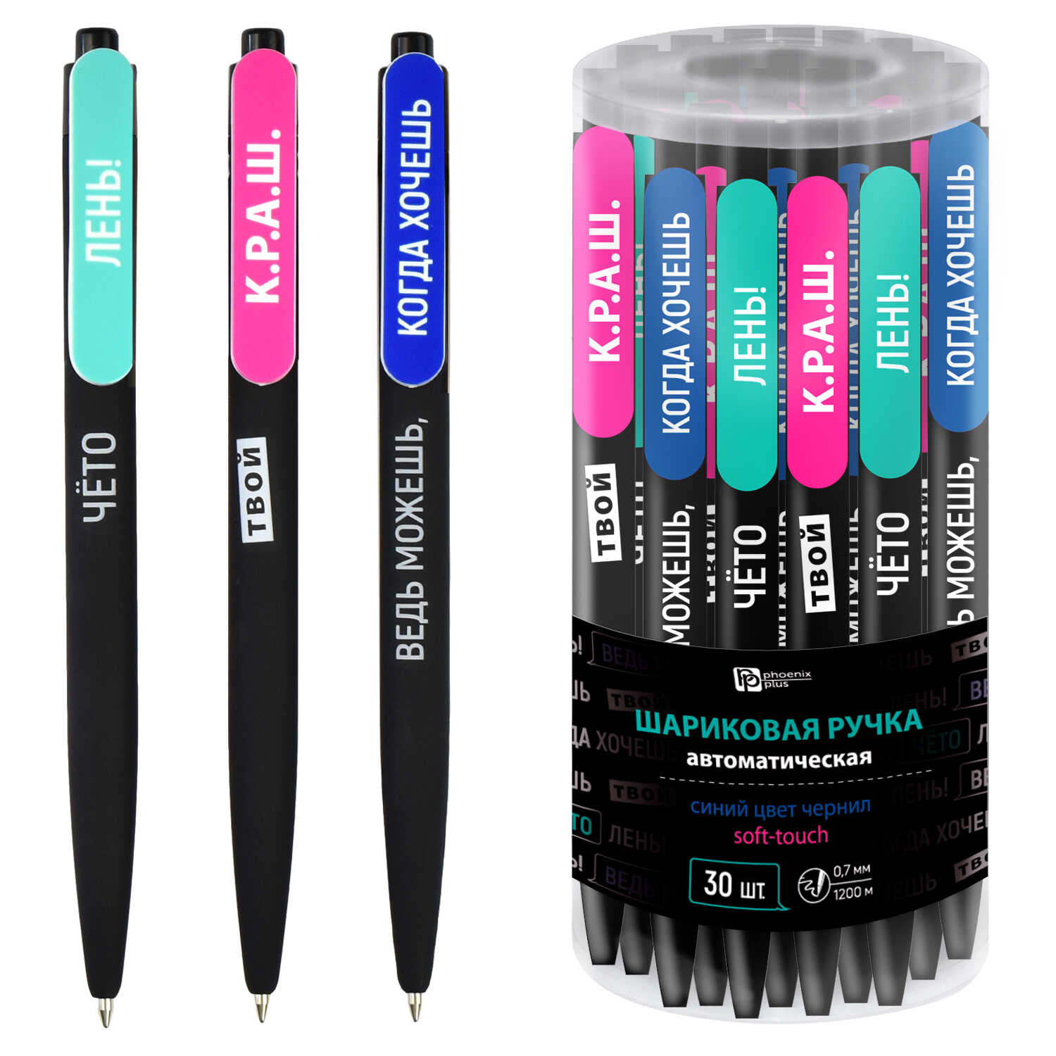 Ручка шариковая автоматическая синяя 0,7мм Фразы с характером ассорти ФЕНИКС+ 64915