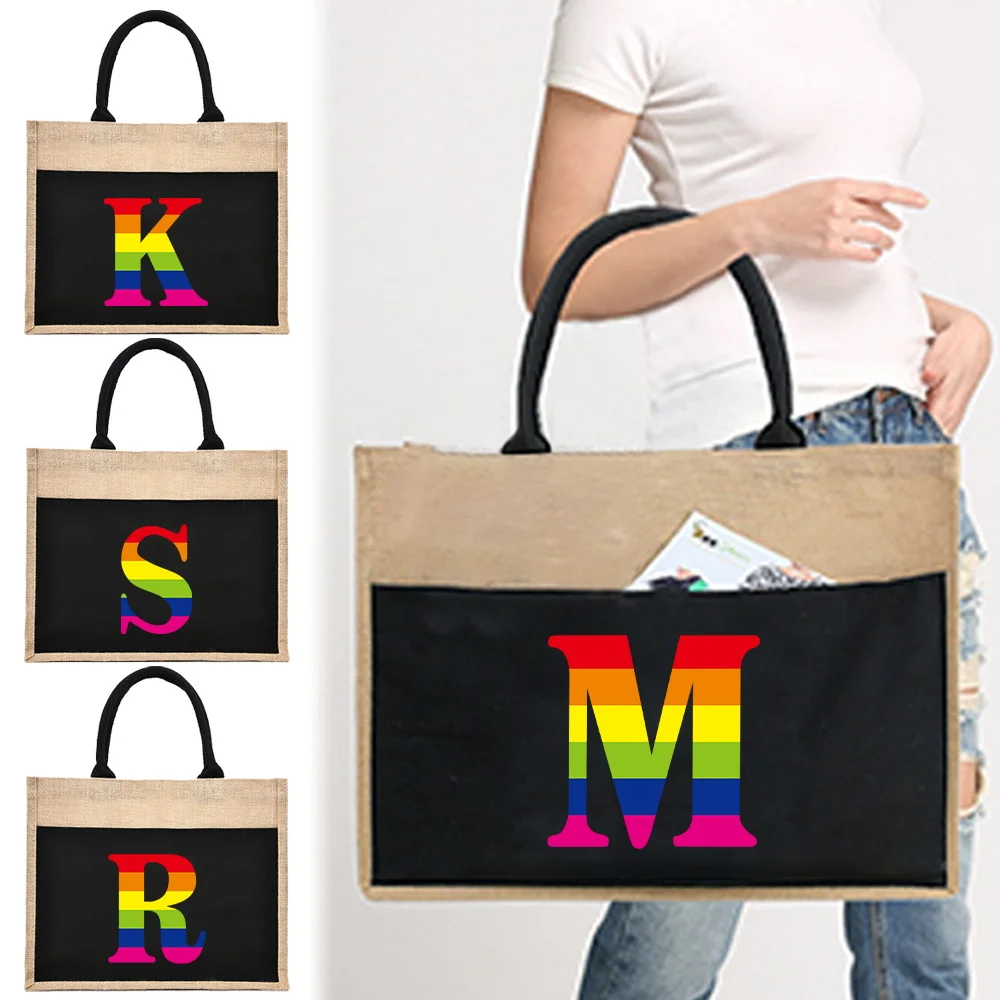Ручная льняная сумка, многоразовая женская сумка для хранения большой емкости, студенческая сумка для покупок на одно плечо, серия радуги, несколько стилей